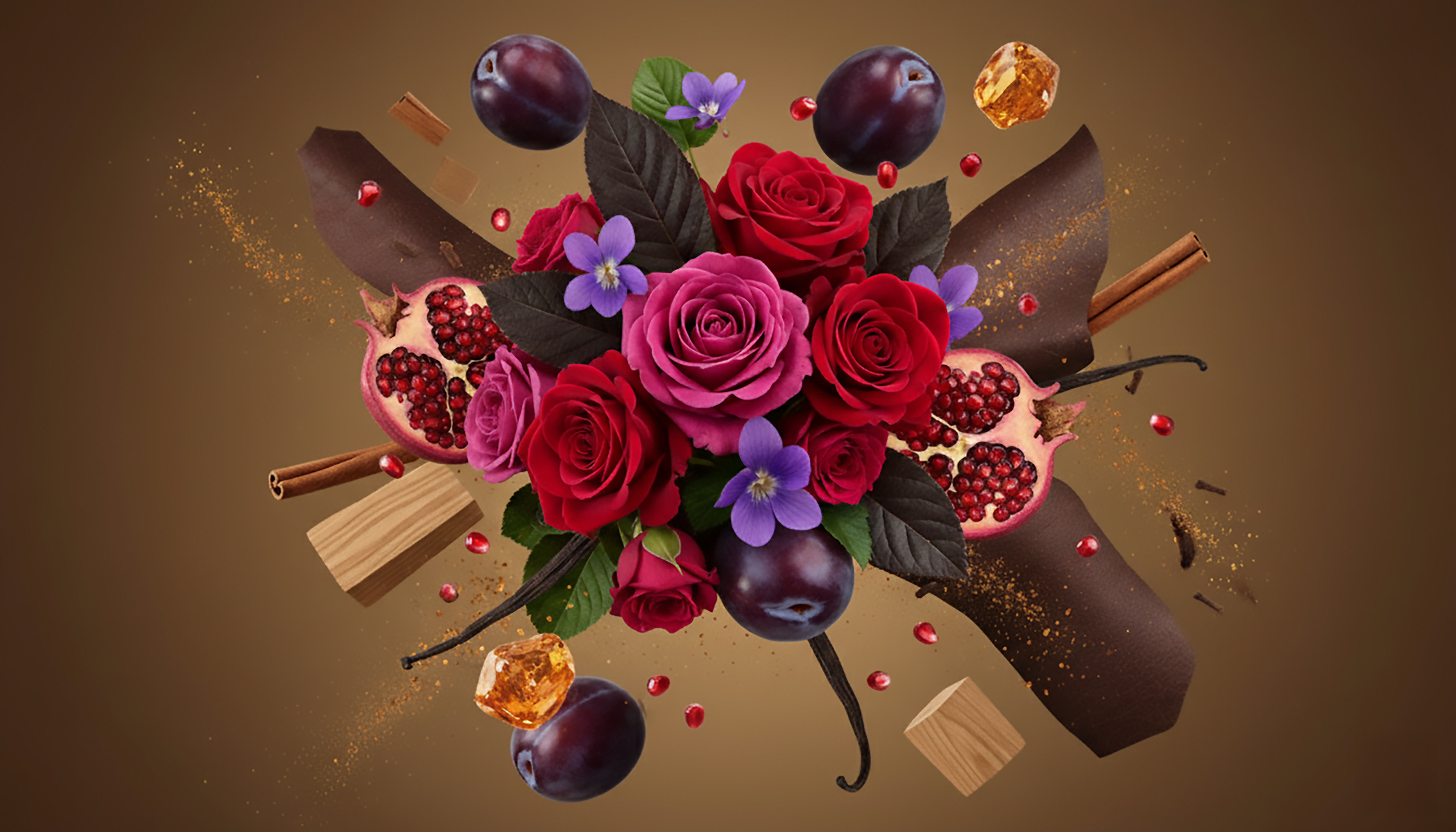 plum, pomegranate, rose, patchouli, vanilla and leather.
